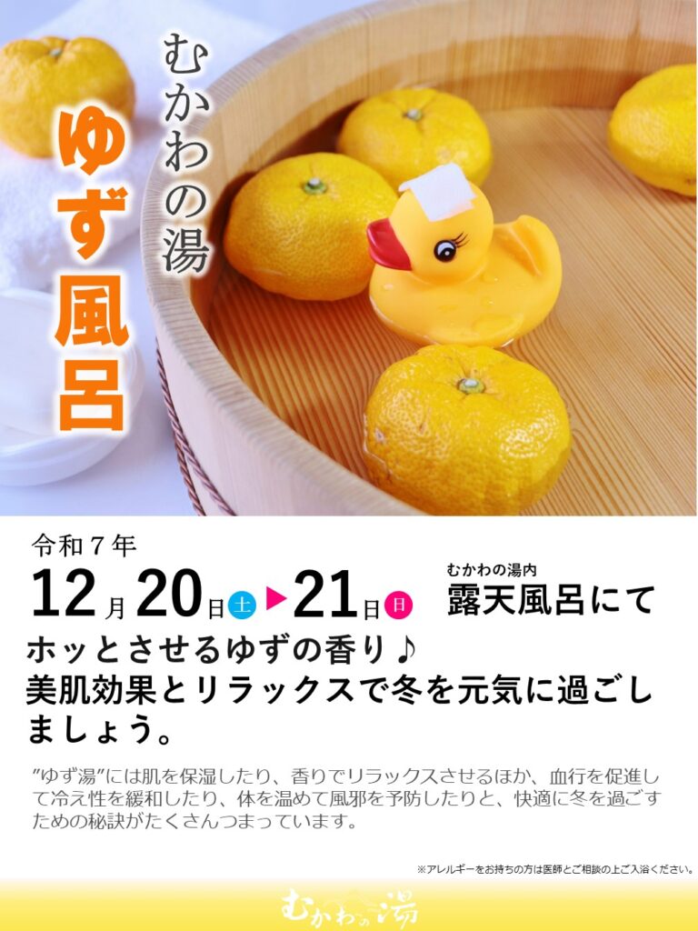 イベント風呂のお知らせ 2025年12月18日 お知らせ, イベント情報 12月のお風呂は「ゆず風呂」を開催します!12月20日(土)、21日(日)の2日間で露天風呂にて行います。ゆず湯には肌を保湿したり香りでリラックスさせるほか、血行を促進して冷え性を緩和したり、体を温めて風邪を予防したりと快適に冬を過ごすための秘訣がたくさんつまっています。美肌効果とリラックスで冬を元気に過ごしましょう♪ ※アレルギーの方はご注意ください。 Share: Older Post 年末年始営業日について