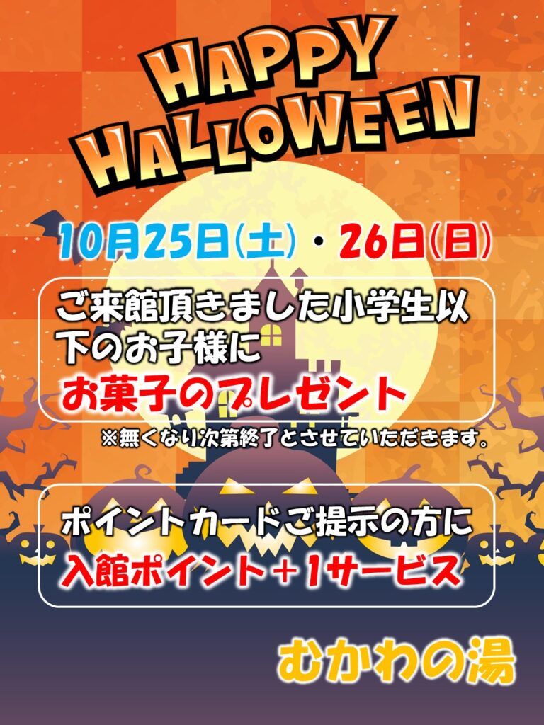 ハロウィンイベントのお知らせ 2025年10月5日 お知らせ, イベント情報 平素よりむかわの湯をご利用いただきまして、誠にありがとうございます。 むかわの湯では、10月25日(土)・10月26日(日)にハロウィンイベントを開催します!ご来館頂いた小学生以下のお子様に「お菓子」をプレゼント!また、ポイントカードをご提示いただいた方に+1ポイントプレゼント! ※お菓子は無くなり次第終了とさせていただきます。 皆様のご来館を心よりお待ちしております! Share: Older Post イベント風呂のお知らせ